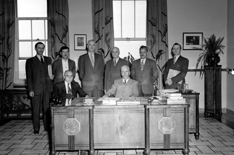 L’Honorable Laurent Barré, Ministre de l’Agriculture, et M. Jules Simard, sous-ministre, reçoivent les membres du Conseil des Recherches. De gauche à droite: Dr Georges Fournier, secrétaire, J.O. Vandal, Dr Georges Maheux, président, J.A. Ste-Marie, Dr H.L. Bérard, Dr J.E. Chevrette / Léo. Fournier . – 1947 (source: Bibliothèque et Archives Nationales du Québec)
