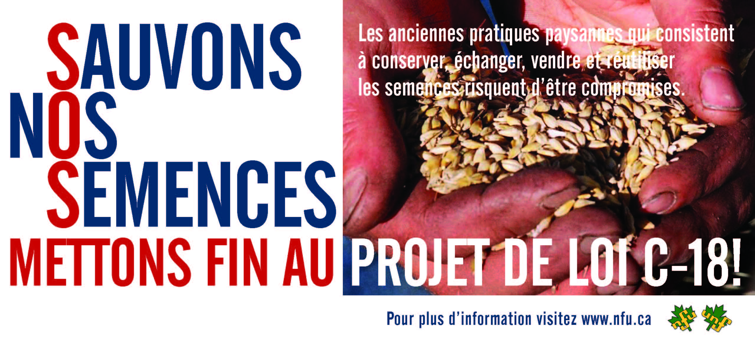 Le projet de loi C- 18, la « Loi sur la croissance dans le milieu agricole«  est un projet de loi omnibus déposé au Parlement le 9 décembre 2013. Il modifie plusieurs lois fédérales agricoles, y compris la loi de la protection des obtentions végétales (POV), des semences, des engrais, de la santé des animaux, etc. S’il est adopté, il donnera aux multinationales de l’agro-industrie beaucoup plus d’argent, de pouvoir et de contrôle, tout en augmentant les coûts de l’agriculture et en réduisant l’autonomie des agriculteurs et la souveraineté du Canada.