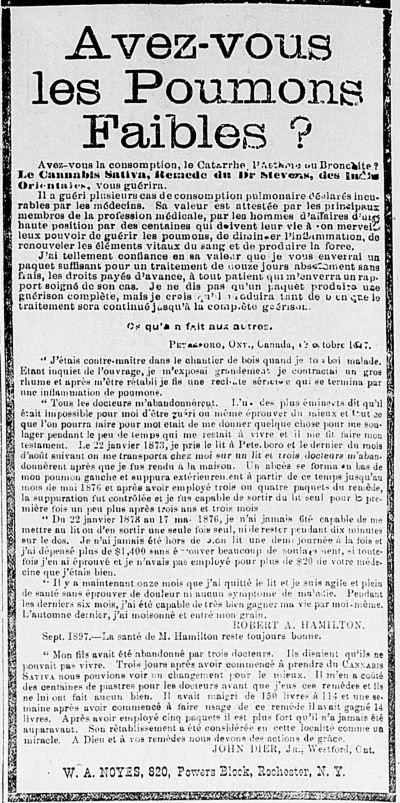 L’histoire du chanvre (partie 1) 16 samedi Mar 2019 Taille d’origine  : 400 × 803 ≈ Laisser un commentaire Ancienne publicité sur le cannabis sativa (source: Le Courrier du Canada, jeudi 31 mars 1898)