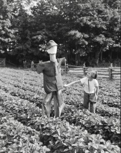 Épouvantail à corneilles pour un champ de fraises à la municipalité de Sainte-Famille à l’Île d’Orléans (photo: Omer Beaudoin, 1951)
