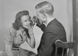 Harold Jewel tente, à l’aide d’un mouchoir, d’enlever une poussière de l’oeil de Rita Bode (Photo: Conrad Poirier, 1944)