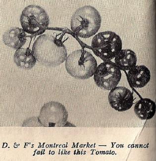 MONTREAL MARKET (73 days) Prolific Medium Early – This tomato is becoming very popular wherever grown. The fruit is of medium size, deep globe in shape, very smooth and seems to have very little cracking. They are very solid and an excellent deep red color throughout. The vines are strong and very prolific. In season D & F’s Montreal Market ripens about with Bonny Best. Because of its fine quality and heavy yield we believe it will have a place for the home garden as well as market shipping and canning.