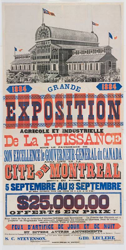 À partir de 1851, s’installe au Québec une tradition inspirée de l’exposition universelle de Londres: les grandes expositions agricoles et industrielles. Lors de cet événement annuel prévu une semaine en août ou septembre, on pouvait y voir toutes sortes d’exposants liés aux animaux de la ferme, curiosités scientifiques, horticulture, machineries agricoles et aux beaux-arts. Ces derniers avaient la possibilité de gagner des prix au mérite comme lors des grandes expositions universelles d’Europe. Le public se faisait aussi offrir des divertissements comme des tours en ballon ou de manèges, des courses de chevaux, des feux d’artifices, etc. Aux cours des années, plusieurs de ces exhibitions se déroulèrent à Montréal dans un édifice appelé le Palais de cristal, une replique plus modeste du « Crystal palace » de Londres (voir image ici-bas). Situé sur la rue Sainte-Catherine, il sera relocalisé, en 1879, entre les rues de Bleury et Saint-Urbain, aujourd’hui devenue l’avenue Mont-Royal et le boulevard Saint-Joseph. 17 ans plus tard (1896), un violent incendie détruisit le Palais de cristal obligeant de déplacer l’exposition agricole à tour de rôle dans les villes de Saint-Hyacinthe, Trois-Rivières et Sherbrooke. L’affiche ici-haute de 1884 mesurant, en vraie, plus de deux mètres de hauteur, se veut une représentation typique du design graphique associé jadis à ce type d’activité; qu’il soit au Canada ou aux États-Unis. Pour ceux qui se poseraient la question, les anciens écrits expliquent que le terme « Puissance » mentionné sur l’affiche fait référence au Dominion du Canada, créé par la loi constitutionnelle de 1867.