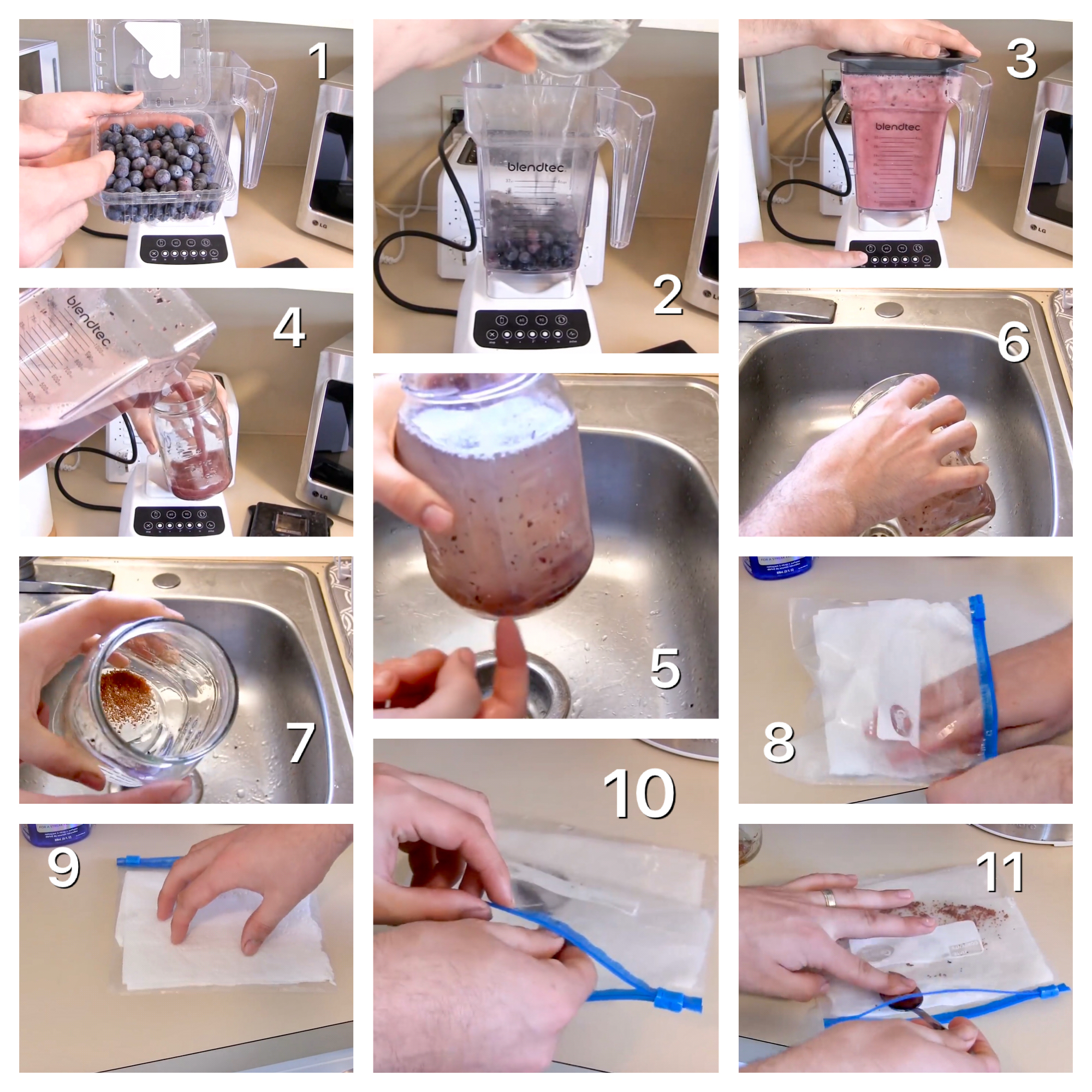 Par la suite, décongeler vos fruits. Transvidez-les dans un mélangeur avec 4 tasses d’eau (image 2). Lors du broyage (pas plus de 10 secondes), la pulpe aura tendance à aller vers le haut contrairement aux semences viables plus lourdes, qui elles, iront vers le bas (image 3). Enlever le surplus d’eau et de pulpe. Verser vos semences dans un pots en verre et ajoutez-y de l’eau pour rincer (image 4 et 5). Encore une fois, vider le surplus d’eau pour séparer les résidus afin de ne conserver que les semences viables au fond du contenant. Répétez l’exercice jusqu’à satisfaction (image 6), c’est-à-dire lorsqu’il ne restera que les semences viables au fond (image 7). L’opération du mixage n’aura pas brisé les graines car trop petites pour les lames. Elles passent au travers. Les adeptes de smoothies aux petits fruits comprendront maintenant pourquoi les graines de fraises ou de framboises ne parviennent pas à être détruites dans le processus pour finir par se loger entre les dents. Vous êtes maintenant prêts pour l’étape de la germination.